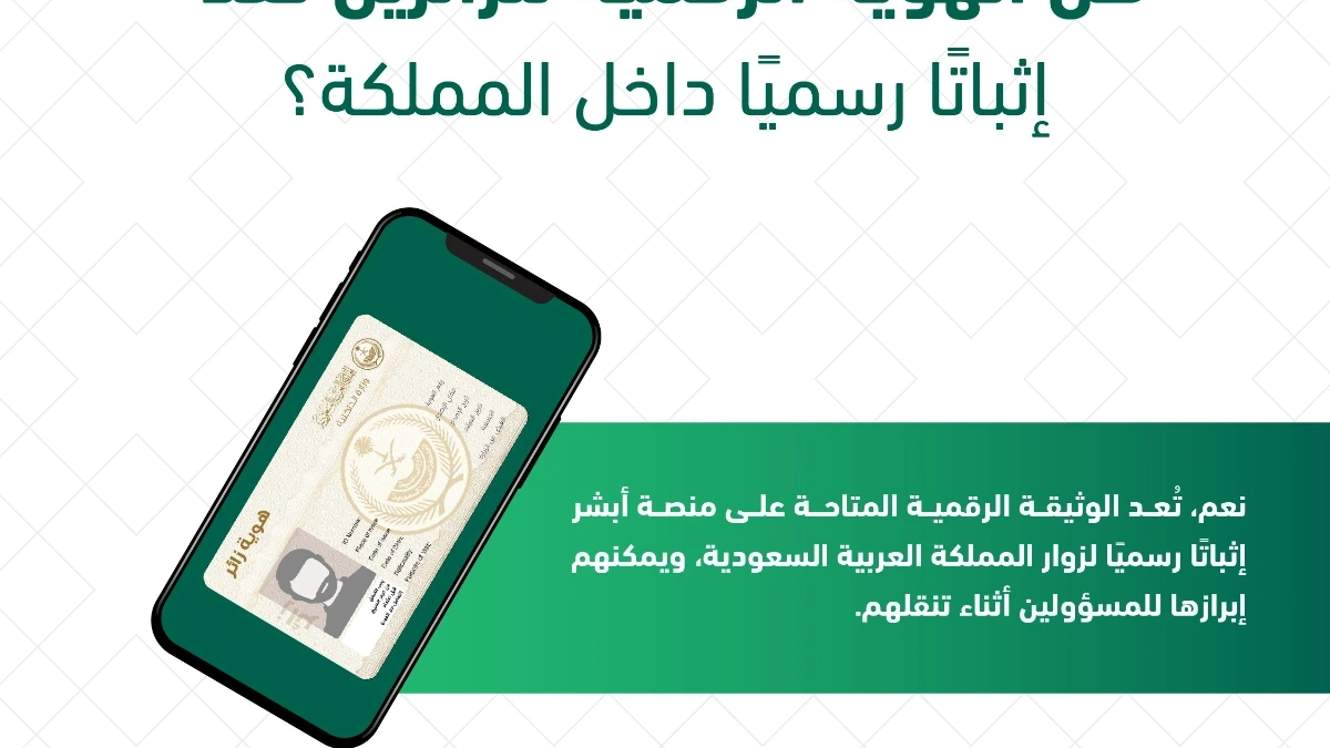 تعد خدمة الهوية الرقمية للزائر خطوة مهمة ضمن جهود المملكة العربية السعودية نحو التحول الرقمي وتقديم متميزة للزوار، وهذه الهوية التي يتم استخراجها إلكترونياً عبر منصة أبشر، هي وثيقة إلكترونية تحتوي على بيانات الزائر الشخصية مثل الاسم والصورة ورقم الجواز، وتصدر بشكل فوري عند وصول الزائر إلى أحد مطارات السعودية، أو المنافذ الأخرى البرية والبحرية.